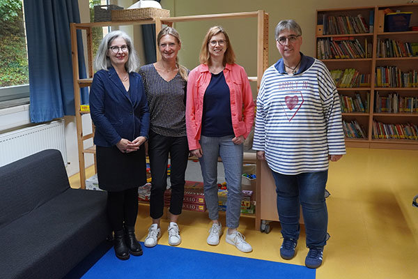 [Das Team hinter „Lesementor Oberberg“ (v.li.): Sylvia Asmussen (Fachstelle für bürgerschaftliches Engagement und Ehrenamt), Dr. Kristina Reiss (VHS Oberberg), Katja Beverungen (Bildungsbüro Oberberg), Dunja Kühr-Honermann (Caritas Oberberg).]