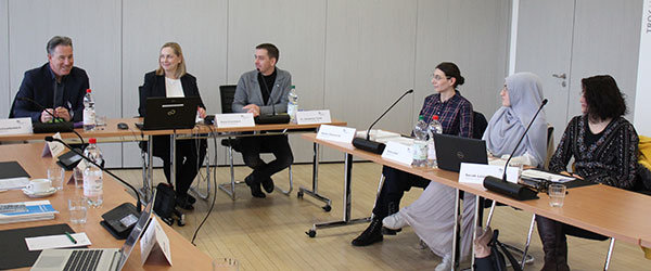 [Foto: Lars Weber --- Sie informierten über das Projekt (v.li.): Ralf Schmallenbach (Kreisgesundheitsdezernent), Kaija Elvermann (Leiterin Gesundheitsamt), Dr. Sebastian Thole (Landeszentrum für Gesundheit NRW) und das Projekt-Team bestehend aus Rabea Riesewieck, Kübra Bidil und Sarah Leisner.]