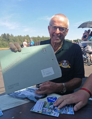 Das Revival der Olympia-Rallye zieht immer wieder frühere Teilnehmer an – so auch Udo Wolf (Bild). Im originalen Briefumschlag brachte er 50 Jahre alte Pressefotos mit zum Flugplatz. Aufbewahrt hat er auch seine Startnummer. Bis nach München hat es der damals 30-Jährige nicht geschafft: „Ich habe den Wagen in der zehnten Sonderprüfung zerknallt.“