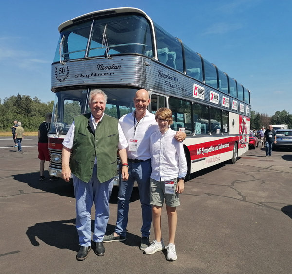 [(v.l.) Konrad, Bernd und Oskar Auwärter nehmen mit dem originalen Pressebus von 1972 an der Olympia-Rallye teil.]