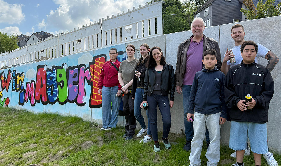 Deshalb wurde mit Vincent Löhr aus Overath ein Profi-Sprayer engagiert, der mit Jugendlichen der Sekundarschule im Walbachtal und Kids vom Jugendzentrum am Aggerstrand die Mauerscheiben gestaltete. Zu sehen sein werden dort Ründerother Motive. Die ersten Graffiti sind fertig und in den kommenden Wochen geht es weiter.