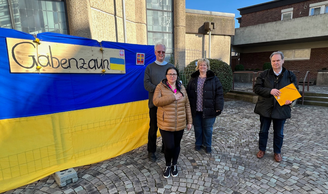 Die gestern angelaufene Kooperation zwischen der Gummersbacherin Valentyna Butulay und der Caritas Oberberg (siehe 7. Meldung) trägt weitere Früchte. Gemeinsam mit Pfarrer Christoph Bersch, Caritaschef Peter Rothausen und der Ehrenamtskoordinatorin Andrea Missbrandt, präsentierte Butulay den sogennanten Gabenzaun an der Katholischen Kirche in der Kreisstadt. Dort können Spenden abgegeben werden, die dann zwischengelagert werden und in den Raum Lemberg (Lwiw) transportiert werden. Dort hat Rothausen Kontakte zu einer Gemeindemitarbeiterin, die in der Ukraine ein Flüchtlingslager einrichten und zudem vor Ort Waisenkinder unterstützen möchte.