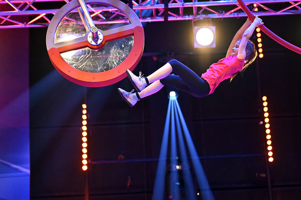 [Foto: TVNOW / Markus Hertrich ----Der Sprung an den "Fly Wheels" bedeutete das Ende von Saras Auftritt bei "Ninja Warrior Germany Kids".]