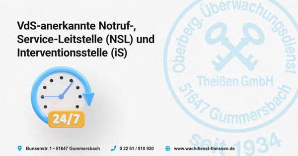 Um dieses Problem zu lösen, bietet der Oberbergische Überwachungsdienst Theißen seine Dienste als VdS-anerkannte Notruf- und Service-Leitstelle mit integrierter VdS-anerkannter Interventionsstelle an. Diese Leitstelle ist rund um die Uhr, sieben Tage die Woche mit erfahrenem und spezialisiertem Personal besetzt.