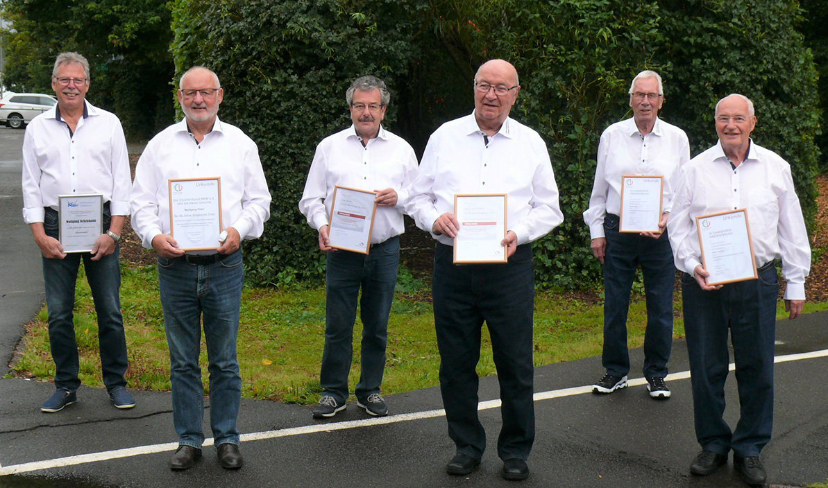 Den gestrigen Probenabend nahm der Vorsitzende Arnfried Berndt zum Anlass, "seine" verdienten Sänger zu ehren, da die zentrale Jubilarenehrung des Kreischorverbandes derzeit nicht durchgeführt werden kann. Mit launigen Worten, Ehrenplaketten, Urkunden und einem konzentrierten "Rachenputzer" zollte Berndt den Jubilaren unter dem Applaus der Sangeskollegen seinen Respekt. Wer mitsingen möchte, erhält unter Tel. 0176/ 64 16 00 94 weitere Informationen.