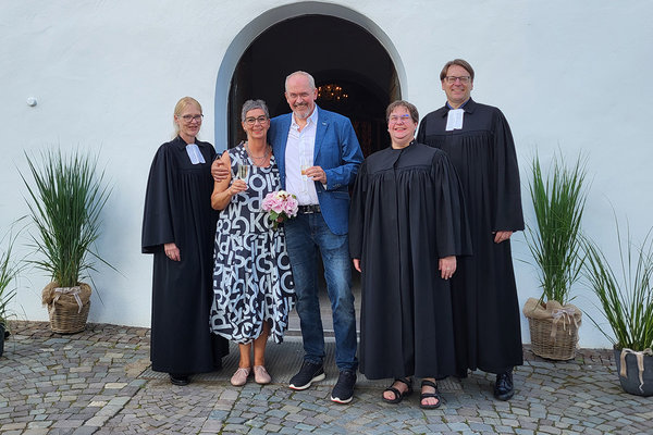 Denn Pfarrerin Anneke Ihlenfeldt, Vikarin Dr. Judith Fresen, Prädikantin Nadine Hagen, Pfarrer Henning Strunk und Prädikantin Alanna Kockskemper führten nach den 20-minütigen Traugesprächen individuelle Trauungen am Freitag durch. Am Samstag gehörten auch Superintendent Michael Braun und Pfarrer Marc Platten zum Team für die Trau- und Segensfeiern. Mit Michael Braun zogen beispielsweise Dana und Dennis zu dem Lied „Stand by me“ in die Kirche ein, dahinter die Söhne Ole und Emil, die auch fürs Blumenstrauß festhalten und die Übergabe der Ringe eingebunden wurden. Ina und Winfried aus Gummersbach-Bünghausen wollten schon länger ihr Trauversprechen erneuern. Geheiratet haben sie vor 30 Jahren – standesamtlich in Nümbrecht und kirchlich in Bielstein. Am 30. Hochzeitstag kauften sie in Trier extra neue Ringe – da hatten sie schon online von der Möglichkeit in Gummersbach gelesen.