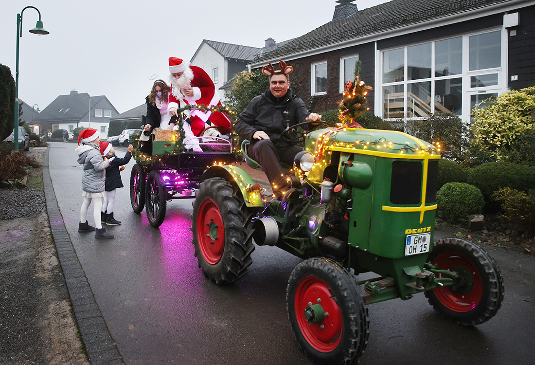 Gespannt warteten am Nachmittag nicht nur die Müllenbacher Kinder mit ihren Eltern auf den Straßen vor den Häusern auf „ihren" Nikolaus und seine Geschenke. Schon von Weitem war der knatternde, als Rentierschlitten geschmückte Trecker mit angehängter Kutsche von Olaf Hinze zu hören und sehen. Teilweise in dichtem Rauch gehüllt, schallte zudem „Last Christmas“ aus der mitgeführten Musikbox mit passender Lightshow.