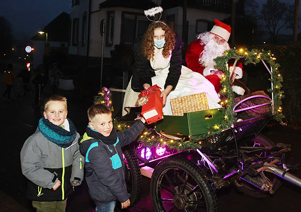 „Eine sensationelle Aktion hier in Müllenbach“, freute sich Anwohner Jens Bopp, dessen Kinder die Präsente strahlend entgegennahmen. Doch es gab auch etwas für die Protagonisten zurück: In der Dorfmitte warteten die sieben- und achtjährigen Daan und Max Westerhof mit Mama und Papa auf das Gespann. In der Hand hielten sie ein selbstgebasteltes Feuerwehrauto, das mit einer roten Schleife versehen war. Darin verflochten war eine Tüte Plätzchen, um den Nikolaus und das Engelchen zu überraschen.