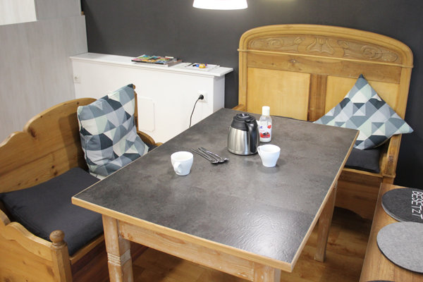 [Ehemann Uwe Naumann konnte seine Fähigkeiten als Schreiner voll einbringen. Er hat alle Möbel im Laden gezimmert, und das aus altem Holz. Die Essecke war früher einmal ein Bett.]