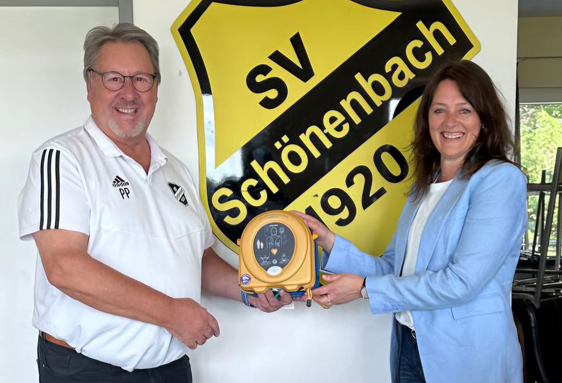 Sport wirkt sich einerseits positiv auf die Gesundheit aus, birgt jedoch andererseits auch das Risiko des plötzlichen Herztods. So ereignen sich laut der deutschen Herzstiftung in Deutschland jährlich etwa drei Todesfälle pro 100.000 Sporttreibende. Um in solchen Situationen entsprechend reagieren zu können, hat der SV Schönenbach durch die Firma „tecfor care“ einen Defibrillator gespendet bekommen. Dies teilt die Stadt Waldbröl mit.