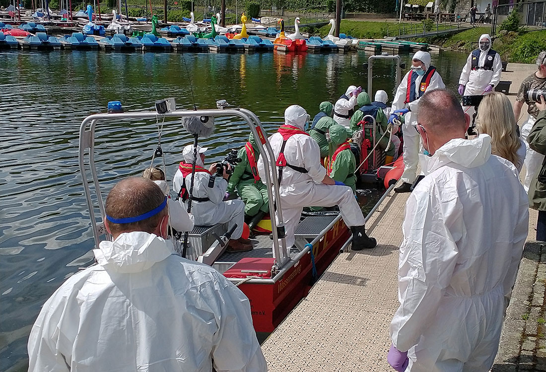 Ulrike Daniels, Tierärztin und stellvertretende Leiterin des OBK-Veterinäramts, war bei der Übung in einem großen Team mit Kollegen aus dem Oberbergischen Kreis und den Nachbarkreisen unterwegs. Mit grünen und weißen Overalls, Gummistiefeln und mehreren Lagen Einmalhandschuhen geschützt, suchte sie mit ihrem Team auf dem Kemnaderstausee nach toten Enten. Das DLRG hatte die Tierärzte mit Schwimmwesten ausgestattet und transportierte sie in Booten über den See. 18 Enten - alle allerdings aus Gummi - wurden von den Booten mit Keschern aus dem Wasser geborgen und in Kunststoffsäcke verpackt.