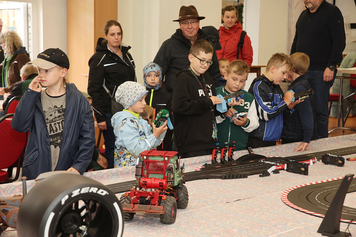 Neben der Technik unter freiem Himmel ging es auch auf der rund 30 Quadratmeter großen Carrera-Bahn rasant zu. Werner Rampelt, Mitverantwortlicher für den Aufbau, erklärte: „Die Bahn besteht aus vier zusammengefügten digitalen Carrera-Systemen. Hier fahren wir mit bis zu vier Autos gleichzeitig – inklusive Überholmanöver.“ Besonders die Kinder waren begeistert: „Die stehen hier Schlange, mit breitem Grinsen im Gesicht – und sind dabei unglaublich diszipliniert. Es ist eine Freude, ihnen zuzusehen.“ Und wie steht es um die Erwachsenen? Rampelt schmunzelt: „Die trauen sich meist nicht – gegen die Kinder haben sie ohnehin keine Chance.“
