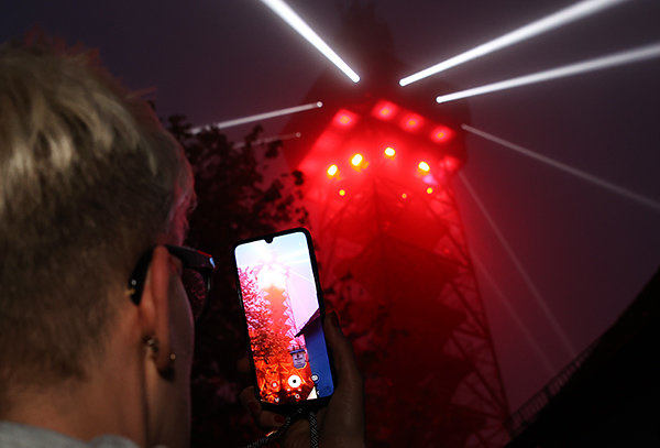 Am Turm hatten sich einige Besucher eingefunden, um dem Farbenspiel beizuwohnen. Bedauerlich für die Beteiligten war der aufgezogene Nebel. Denn bei klarem Wetter wäre der in tiefes Rot getauchte Turm mit den hoch oben angebrachten „Skybeamern“, die ihre Laserstrahlen tief in den Himmel hineinwarfen, im Oberbergischen weithin sichtbar gewesen.