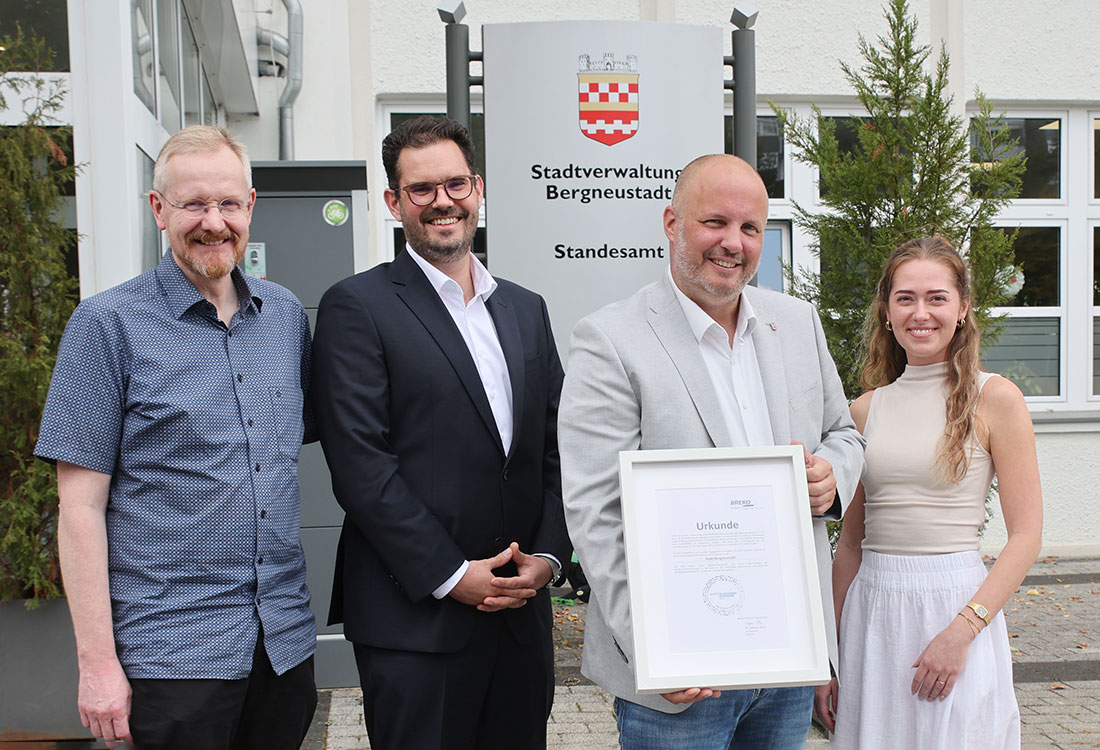 Die Stadt Bergneustadt gehört zu den bundesweit zehn schnellsten Breitbandkommunen in Deutschland. Bürgermeister Matthias Thul freute sich heute gemeinsam mit dem Bau-Fachbereichsleiter Andreas Wagner und der Breitbandbeauftragten Isabell Protz über die Auszeichnung „Echte Glasfaserkommune“. Diese wird auf Grundlage einer Bewerbung vom Bundesverband Breitbandkommunikation (BREKO) verliehen. Roman Skrodzki, Referent für Kommunalpolitik, hatte die Urkunde im Gepäck und überreichte sie an die Vertreter der Verwaltung.