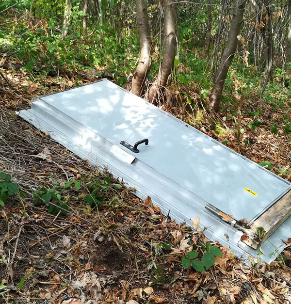 [Die Vereinsmitglieder vermuten, dass die Tür mit einem Traktor mit Palettengabel beschädigt wurde.]
