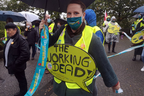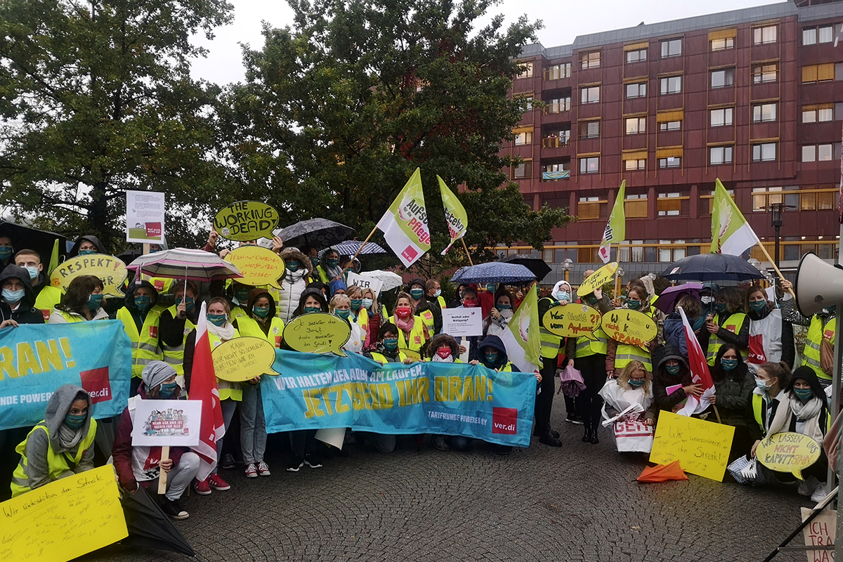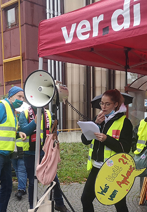 „Personaleinsparungen werden auf unserem Rücken und dem der Patienten vollzogen“, kritisierte Kathi Klawunder, Pflegerin auf der Corona-Infektionsstation. Viele Auszubildende hätten bereits nach Abschluss ihrer Lehre aufgrund der Überbelastung keine Lust mehr, in der Pflege zu bleiben. Es dürfe nicht sein, dass in einem Nachtdienst ein Pfleger für 40 Kranke zuständig sei. „Wir sind am Limit, die Kollegen resignieren, ihnen ist die Müdigkeit ins Gesicht geschrieben. Es ist eine Frechheit, eine Null-Runde zu fordern.“