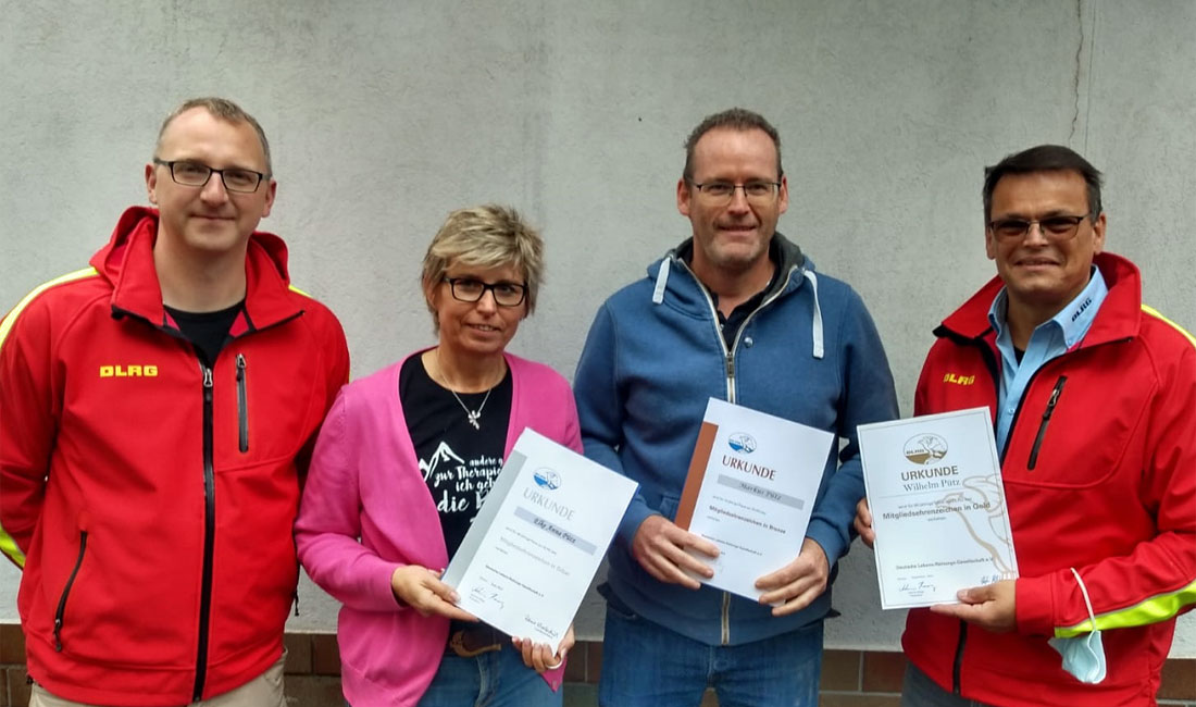 Elke Pütz wurde für ihre 40-jährige und Markus Pütz für seine zehnjährige Mitgliedschaft geehrt. Als herausragend bezeichnen die beiden Vorsitzenden eine weitere Ehrung, die aus Krankheitsgründen nicht persönlich übergeben werden konnte. So überreichte Richling das Mitgliedsehrenabzeichen in Gold für 60 Jahre Treue zur DLRG für Wilhelm Pütz in Vertretung an dessen Sohn Markus.