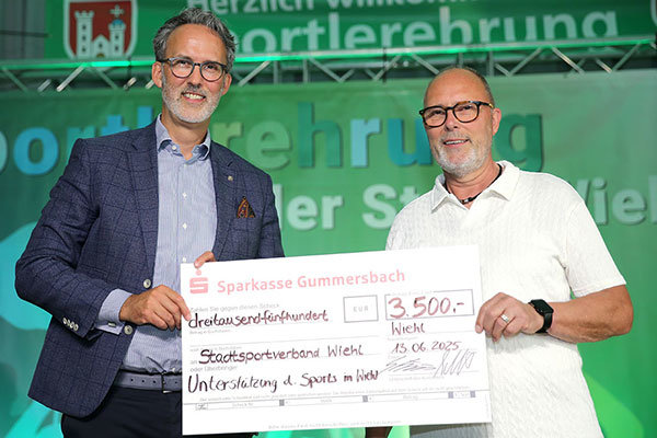 Der heimische Verein war an dem Abend aktiv beteiligt. Der BV09 Drabenderhöhe kümmerte sich um das leibliche Wohl der Gäste und sammelte außerdem Spenden für die Erneuerung des Kunstrasens. Zudem zeigten die „Macarenas“ des BV09, eine Showtanzgruppe der Turner, vor der Bühne, was sie drauf hat. Für Musik an dem Abend sorgten Julia Liebiedieva und Robert Schuller. Damit der Stadtsportverband die Sportler und Vereine weiter unterstützen kann, hatte Mario Scheidt, stellvertretendes Vorstandsmitglied der Sparkasse Gummersbach, eine Spende in Höhe von 3.500 Euro dabei (Foto).
