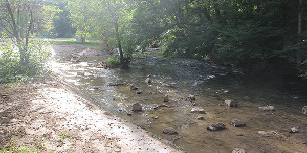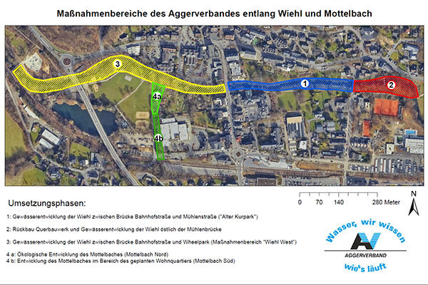Die erste von vier Maßnahmen wurde bereits im Sommer 2019 umgesetzt. Im alten Kurpark wurde das linke Wiehlufer zwischen Mühlenbrücke und Bahnhofstraße renaturiert. Im Wiehlpark gibt es neben den Arbeiten an der Wiehl zusätzlich das Projekt Mottelbach (Bild). Das Gewässer wird ähnlich der Wiehl renaturiert und aufgewertet im Bereich zwischen dem ProMarkt-Gelände und der Mündung in die Wiehl. Hier werden etwa 660 Kubikmeter Erde rausgeholt, sodass der Bach Platz zur Entfaltung bekommt. Mehr Wasser sollte er dafür auf jeden Fall haben, denn künftig muss der Bach nicht mehr den Teich im Park mit Wasser versorgen. Das übernimmt dann die Wiehl. Die Aufwertung des Mottelbachs startet am 22. September, die Bauarbeiten sollen bis Ende Oktober beendet sein.