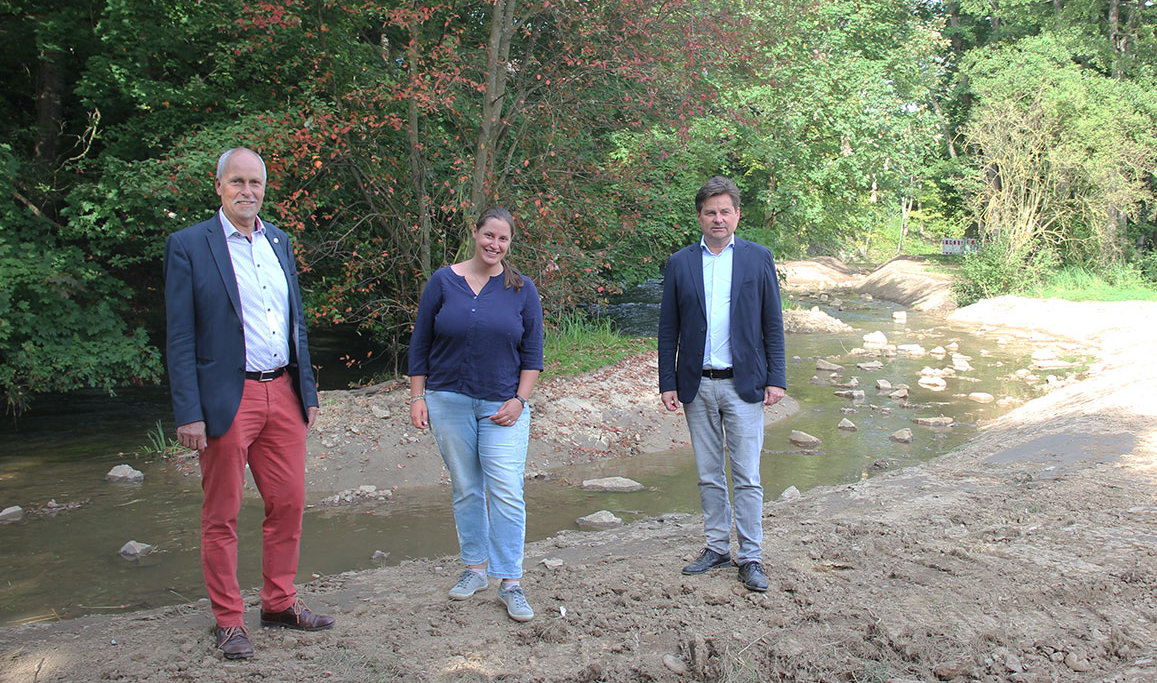 Gehört hat man die Wiehl im Freizeitpark schon immer. So richtig gesehen und wahrgenommen hat man den Fluss aber lediglich im hinteren Bereich zwischen Kinderspielplatz und Wheelpark. Zu sehr war das Ufer hinter Bäumen, Böschungen und Befestigungen in einem Korsett gefangen. „Jetzt soll die Wiehl erlebbar werden“, sagte Bürgermeister Ulrich Stücker bei einem Ortstermin auf der Baustelle Wiehlpark gestern. Mit dabei war auch der Aggerverband um Vorstandschef Prof. Dr. Lothar Scheuer und Projektleiterin Dr. Maike Hünninghaus. Der Verband hat die Revitalisierung der Wiehl in enger Absprache mit der Stadt geplant. Die Maßnahme im alten Kurpark ist bereits abgeschlossen. Nun folgt seit August im Park der größte Abschnitt – und es ist schon jetzt zu sehen: Der neue Park hat viel mehr Wiehl zu bieten.