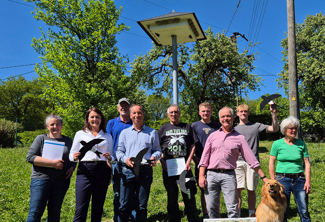 „Mit dem Projekt ‚Artenschutz für Gebäudebrüter‘ setzt sich die Nabu-Ortsgruppe aktiv für den Erhalt heimischer Vogelarten ein, die auf Nistplätze an Gebäuden angewiesen sind. Besonders Mehlschwalben, Mauersegler und Hausrotschwänze finden in unserer zunehmend versiegelten und modernisierten Bauumgebung immer seltener geeignete Brutplätze“, führte Bürgermeisterin Weber in ihrer Ansprache an. „Unser Dank gilt insbesondere Monika Behnke für die Bereitstellung der Fläche, dem Nabu und seinem Vorsitzenden Reiner Stegemann und dem LEADER – Programm, das dieses Projekt durch seine Förderung möglich gemacht hat.“