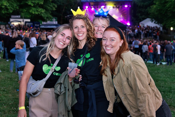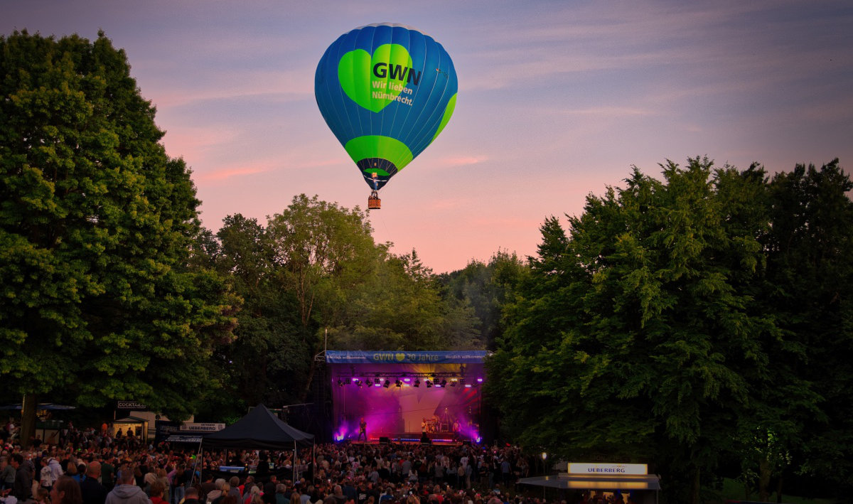 Mit dem Aufsteigen des Heißluftballons der GWN bot das Open-Air-Event einen weiteren Höhepunkt. Während Kasalla die Bühne rockte, erschien „Lutz“ am abendlichen Himmel. „Wir sind alle ein bisschen verrückt. Unser Glasfasernetzwerk heißt Luzie, daher haben wir den Ballon Lutz genannt“, sagte Tuttlies. Einen besonders guten Platz hatten die Gäste auf der Wiese oberhalb des Parks. Mit Decken und Klappstühlen ausgerüstet, hatten es sich dort viele Besucher gemütlich gemacht. Am Eingang bekamen die Gäste Gutscheine für ein Freigetränk, das an den entsprechenden Stationen eingelöst werden konnte. Außerdem lockten Stände mit Snacks. Schnell ein Foto vom Abend knipsen? Das war am Selfie-Spot möglich.