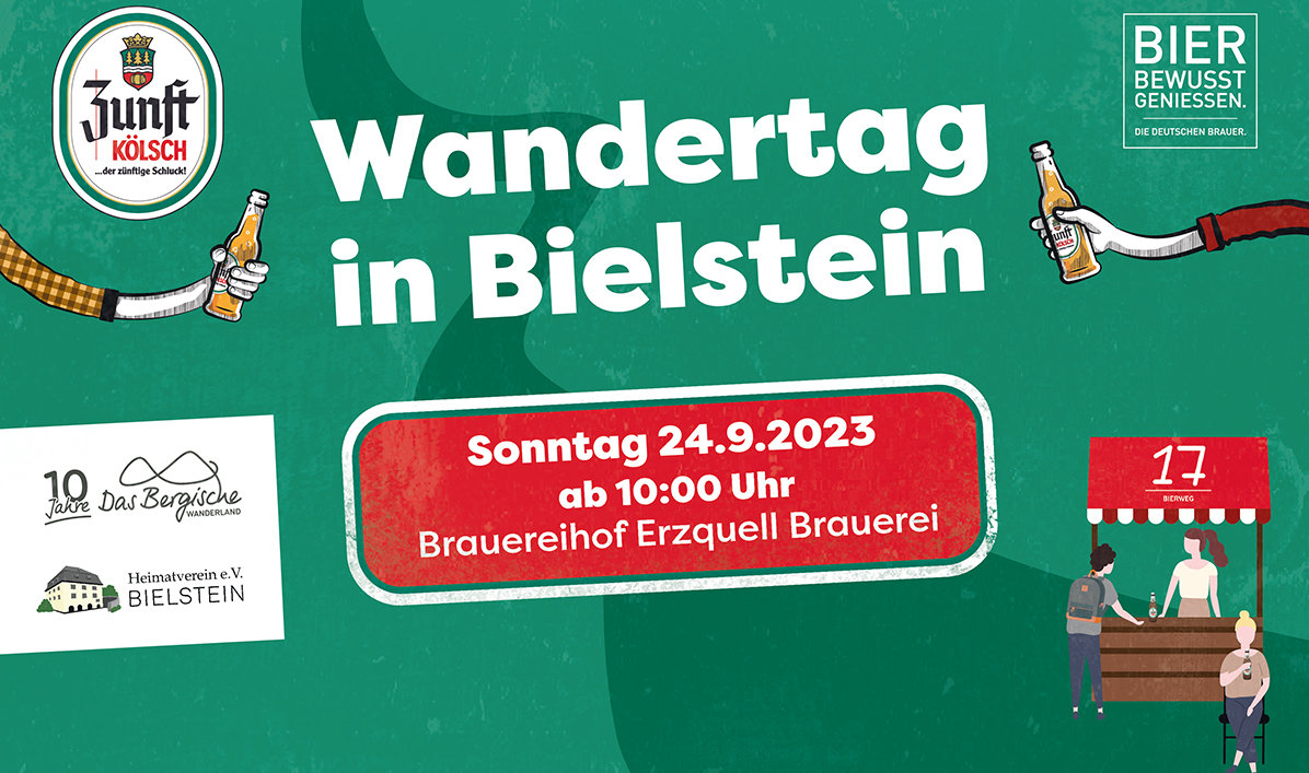 Im Rahmen der 9. Bergischen Wanderwoche lädt die Erzquell Brauerei in Kooperation mit „Das Bergische Wanderland“ und dem Heimatverein Bielstein zum Wandern auf dem Bierweg und dem Rundweg in Bielstein ein. Am 24. September ab 10 Uhr gibt es Verpflegungsstationen mit regionalen Spezialitäten unterwegs und auf dem Brauereihof. Dort erwartet die Besucher ein buntes Rahmenprogramm mit live Musik im Biergarten.
