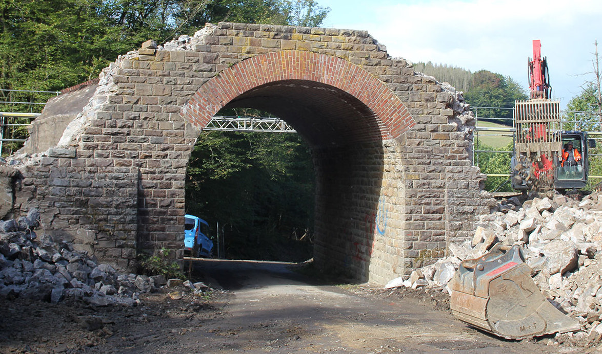 Heute liefen die beiden Kettenbagger, ein 35-Tonner und ein 21-Tonner, dann weiter auf Hochtouren. Gegen 13 Uhr startete der letzte Teil des Abbruchs und der Bogen fiel. Das Abbruchgut wird nun noch bearbeitet, bis es voraussichtlich ab Donnerstag abgefahren wird. Für das Unternehmen ist das Projekt ein alltägliches. Sechs bis sieben Brücken im Jahr baue die Firma, der Gleis- und Stahlbetonbau ist das Hauptgeschäft. „Abrisse machen wir etwas seltener.“ Mit unliebsamen Überraschungen war jedoch bei der reinen Steinbrücke nicht zu rechnen.