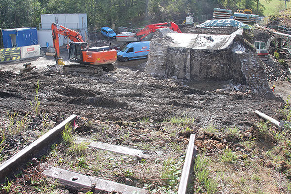 Nachdem die Vorarbeiten schon weit gediehen waren, wurde gestern mit dem Abriss der Flügelwände begonnen, sodass anschließend der Boden dahinter weggeholt werden konnte. 20 Lkw-Touren seien dafür gefahren, insgesamt handelte es sich nochmals um 500 Tonnen. Da die Bodenwerte stimmten, wird das meiste davon wiederverwertet werden können.