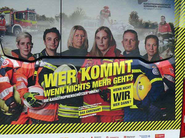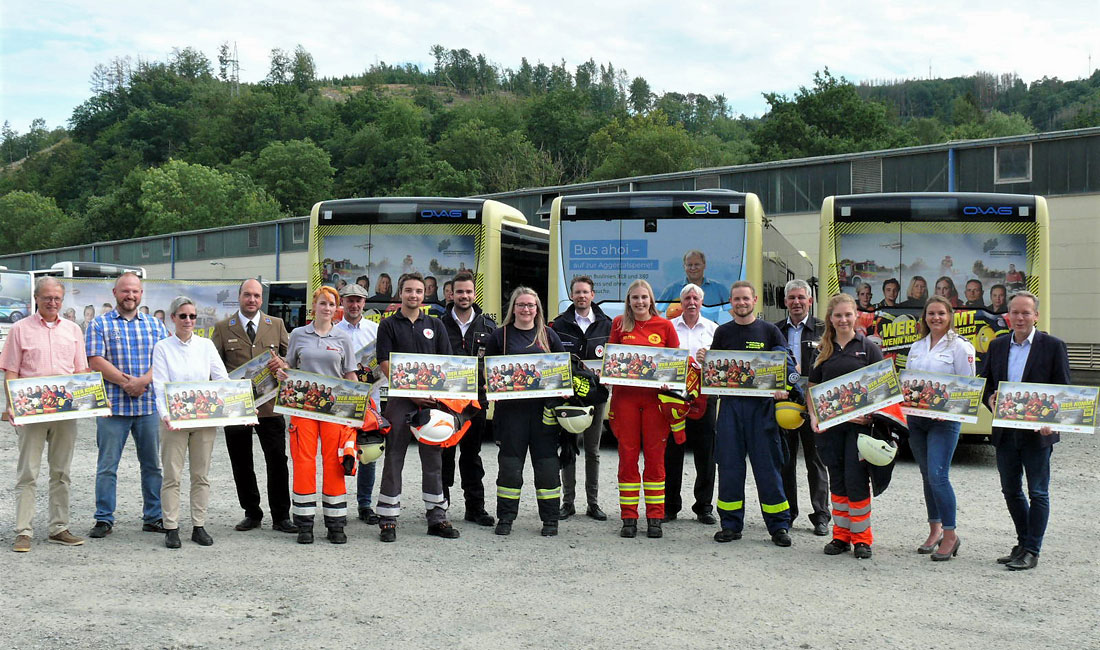 Mit der Bereitstellung entsprechender Layouts für sämtliche Kreise und Städte initiierte das NRW-Innenministerium bereits im Mai 2021 die Medienaktion "Wer kommt, wenn nichts mehr geht" um Nachwuchskräfte für den ehrenamtlichen Einsatz in Hilfsorganisationen anzuwerben. Die Idee nutzen der Oberbergische Kreis und seine "HiOrgs", um in Zusammenarbeit mit der Oberbergischen Verkehrsgesellschaft und dem Verein Rettung Oberberg "eigene Köpfe" werbewirksam in die Öffentlichkeit zu bringen. Parallel zum Jahrestag der Unwetterkatastrophe 2021 stellten gestern alle Verantwortlichen die "Oberbergische Version" der Kampagne auf dem Betriebshof der OVAG in Niederseßmar vor.
