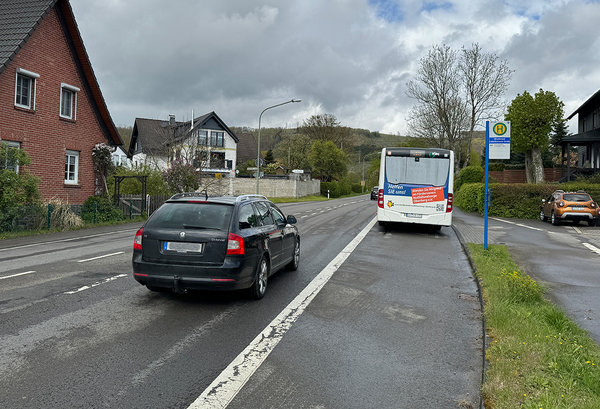 [Laut SPD ist vielen Eltern die Querung der B 55 nicht nur im Ortskern, sondern auch an dieser Bushaltestelle zu gefährlich.]