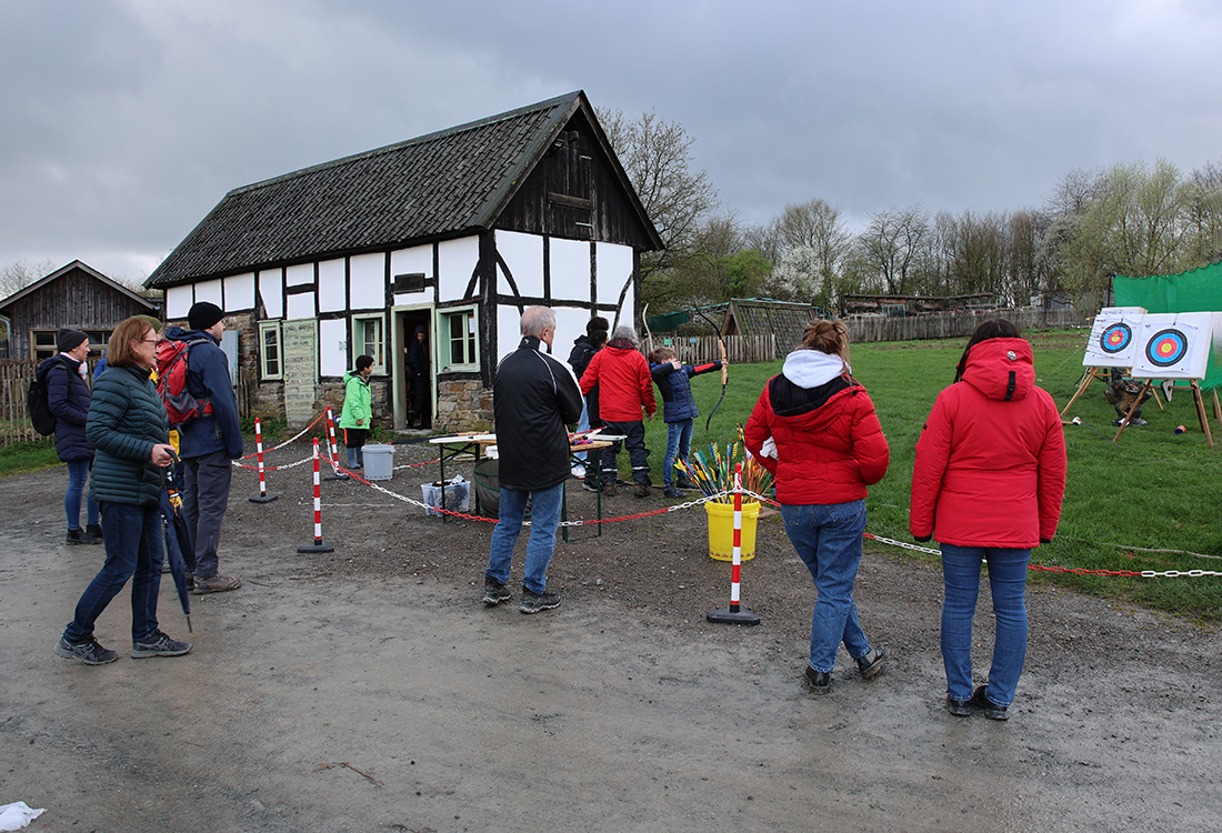 Der Besuch der „Evangelischen Elementarschule Hermesdorf“ auf dem Gelände des Freilichtmuseums war für den 14-jährigen Dmitry aus Bergneustadt trotz Osterferien kein Problem. „Das gefällt mir gut hier“, kommentierte der Teenager den Schulraum, der nach Vorlage einer historischen Fotografie mit Holzbänken und einem gusseisernen Ofen originalgetreu ausgestattet ist. Kinder und Heranwachsende, die eher Lust auf das Ferien-Mitmachprogramm hatten, testeten ihre Zielwasser-Potentiale beim Bogenschießen, Dosenwerfen oder vergnügten sich mit historischem Holzspielzeug in der Zehntscheune.