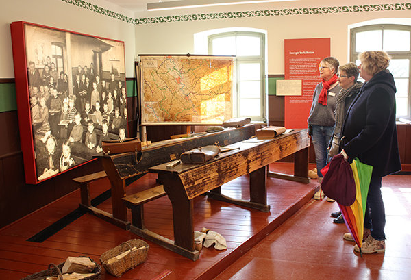 [Angelika Braun (li.) vom LVR-Besucherservice hatte wissenswerte Fakten zur „Elementarschule Hermesdorf“ in petto.]