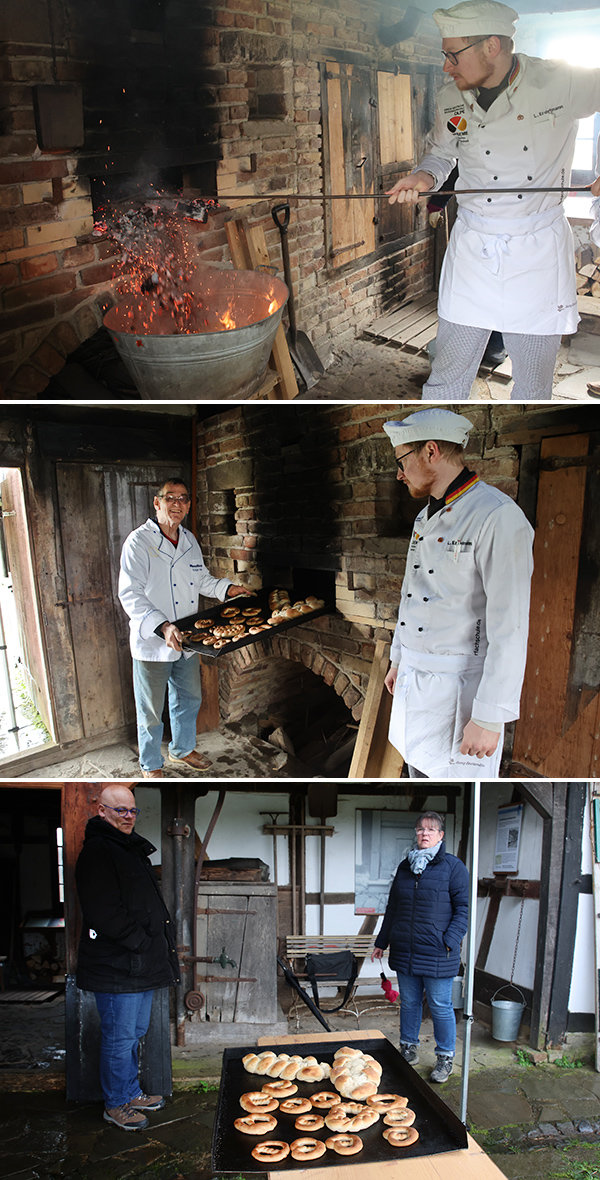 [Bäckergeselle Luca Erdelmann holt die Buchenholz-Glut, Konditorgeselle Rüdiger Hösterey das Backblech aus dem Ofen, auf dem die frisch gebackenen Burger-Brezeln den Besuchern das Wasser im Munde zusammen laufenlassen.]