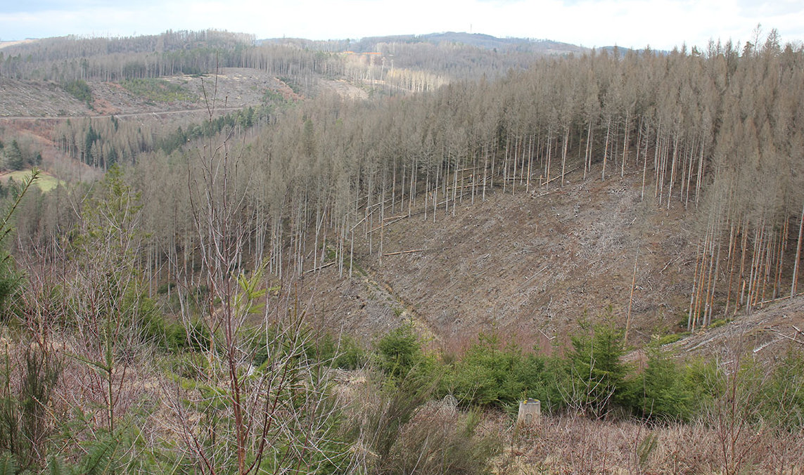 Positiv ist auf der anderen Seite der mittlerweile große Fortschritt der Wiederbewaldung der Schadflächen. Wenngleich die Schadfläche immens ist, ist die gute Nachricht, dass bereits auf 65 Prozent der Fichtenschadflächen wieder junger Wald heranwächst. Hierzu zählen sowohl die Flächen, auf welchen sich natürlicherweise neue Bäume, häufig wieder Fichten und Birken angesamt haben, als auch die Flächen auf welchen aktiv mit Eichen, Douglasien, Lärchen, Buchen gepflanzt wurde.