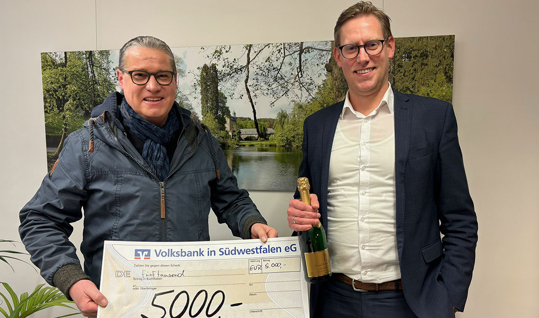 Markus Meier aus Marienheide hat beim Gewinnsparen der Volksbank in Südwestfalen bei der Ziehung im Oktober 5.000 Euro gewonnen. Dies hat das Kreditinstitut mitgeteilt. Volksbank- Mitarbeiter Sebastian Heimes hat nun in Marienheide symbolisch den Scheck übergeben. Von 5 Euro je Los spart der Teilnehmer des Gewinnsparens 4 Euro an. Mit 1 Euro nimmt er an den Monatsverlosungen teil, bei denen es Geld und andere Preise zu gewinnen gibt. 25 Prozent des Spieleinsatzes fließen laut Mitteilung an gemeinnützige Projekte und Institutionen. In Südwestfalen profitierten davon Projekte aus den unterschiedlichsten Bereichen: 2023 zum Beispiel der Kirchsaal Marienheide, das AWO-Bildungszentrum oder der Schulzirkus.