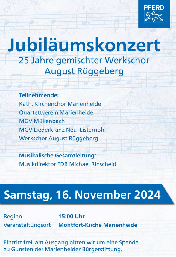 MARIENHEIDE Chor feiert Jubiläum TEILEN Red; 09.11.2024, 12:16 Uhr Marienheide - Anlässlich seines 25-jährigen Bestehens gibt der Rüggeberg-Werkschor am 16. November ein Konzert. WERBUNG