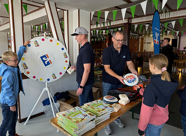 [Sebastian Göldner und Carsten Daase verbanden am Volksbank-Stand Beruf und Hobby.].