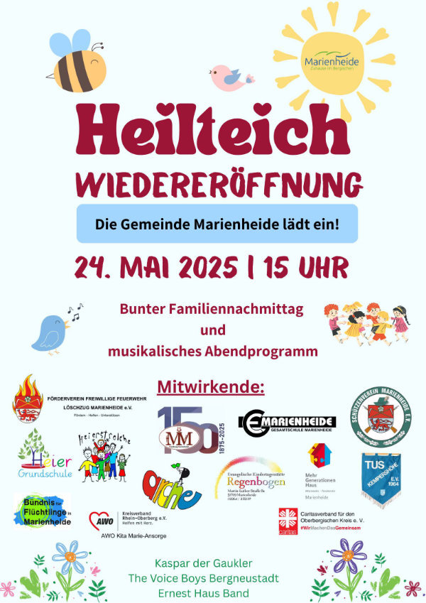 MARIENHEIDE Heilteich wird wiedereröffnet TEILEN Red; 05.05.2025, 13:52 Uhr Marienheide - Buntes Programm am 24. Mai. WERBUNG
