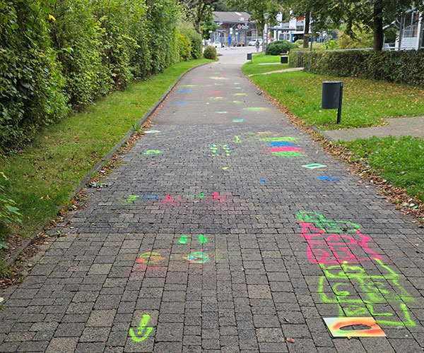 Das Feedback der Eltern sei durchweg positiv gewesen: mehr Platz und weniger Gefahr als an der Schule und ein gesunder Restschulweg für die Kinder. "Ein Gewinn für alle!" Am Donnerstag wurde der Restschulweg von ein paar Kindern der Heier Grundschule bunt gestaltet. Mit Straßen- und Sprühkreide wurden Fußabdrücke und sogar Hüpfkästchen aufgemalt.