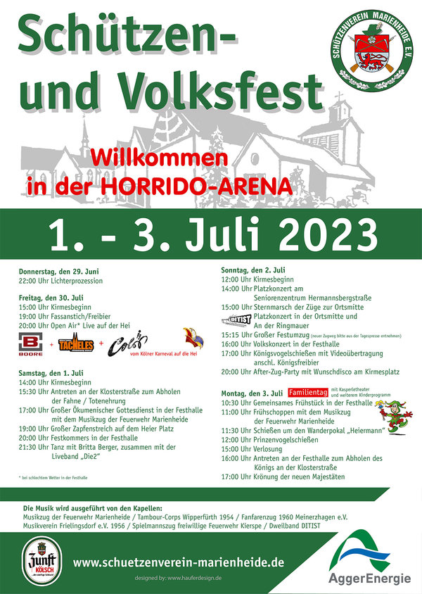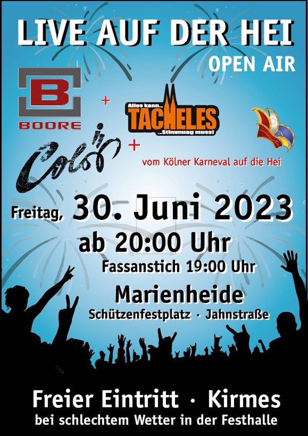 In Marieheide wird wieder Schützenfest gefeiert. Los geht es am Freitag, 30. Juni, mit dem Open-Air-Konzert „Live auf der Hei" auf dem Festplatz an der Jahnstraße. Es spielen mit „De Boore“, „Tacheles“ und „Colör“ drei Bands aus dem Kölner Karneval live auf der Hei auftreten. Am Samstag, 1. Juli, startet dann das Programm des eigentlichen Schützenfestes nachmittags mit Abholung der Fahne, Totenehrung und dem ökumenischen Gottesdienst in der Horrido-Arena (Sporthalle an der Jahnstraße), wo am Abend nach dem Großen Zapfenstreich auf dem Heierplatz auch der Festkommers stattfinden wird.