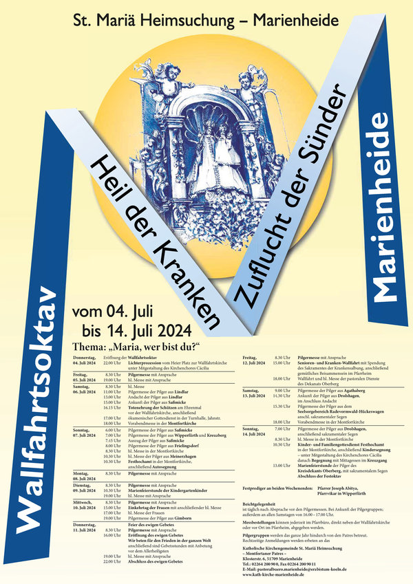 Vom 4. bis 14. Juli findet in Marienheide die Wallfahrtsoktav der Katholischen Kirchengemeinde St. Mariä Heimsuchung statt. In diesem Jahr ist das Thema „Maria, wer bist du?“ Es gibt tägliche Pilgermessen in der Wallfahrtskirche.