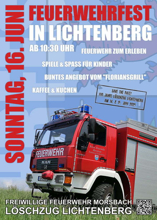 Der Löschzug Lichtenberg führt am 16. Juni sein Feuerwehrfest durch. Los geht es um 10:30 Uhr mit einem Frühschoppen, der vom Musikverein Lichtenberg und dem MGV Hoffnung Lichtenberg musikalisch gestaltet wird. Ab 14:30 Uhr gibt es ein reichhaltiges Kuchenbüffet. Für die Unterhaltung der Kids sorgt die Jugendfeuerwehr mit einer Spielzone. Als besondere Gäste wird Löschzugführer Dirk Wittershagen die Kinderfeuerwehr Morsbach begrüßen können. Weitere Informationen rund um den Löschzug Lichtenberg und die Feuerwehr der Gemeinde Morsbach erhalten Sie unter www.feuerwehr-morsbach.nrw.