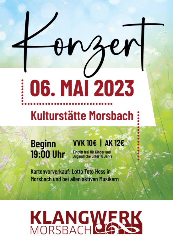 Das Klangwerk Morsbach lädt am Samstag, 6. Mai, um 19 Uhr zum Jahreskonzert in die Kulturstätte ein. Es wird ein gemischtes Programm aus Film, Rock und Pop sowie klassischer Blasmusik geben. Zum ersten Mal wird auch das Kids-Orchester auftreten. Karten können zum Vorverkaufspreis von 10 Euro (Abendkasse 12 Euro) bei Lotto/Toto Hess in Morsbach sowie allen aktiven Musikern erworben werden.