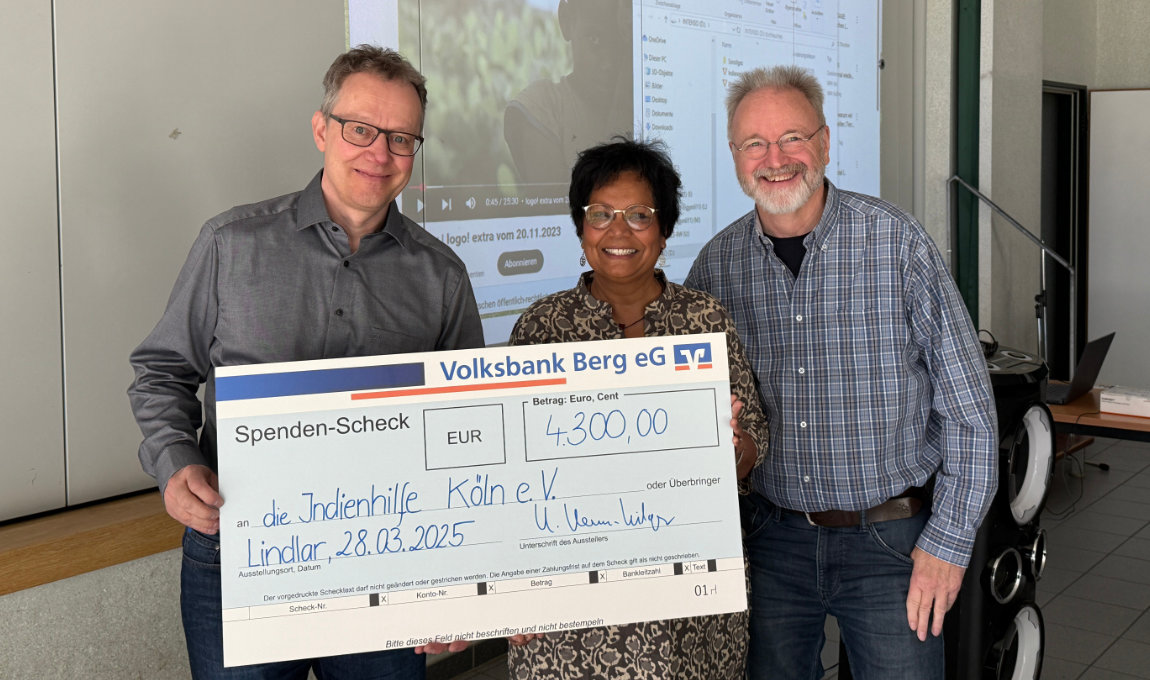 Heute Morgen wurde die Summe von 8.600 Euro vom Schulleiter des Gymnasiums Lindlar, Christoph Menn-Hilger, an Rani und Martin Kramm von der Indienhilfe im Beisein der Fünft- und Sechstklässler übergeben. Die Schüler hatten die 4.300 Euro bei der Weihnachtssammlung zusammengebracht. Dabei nahmen sie an unterschiedlichen Aktionen teil, verkauften Waffeln und sammelten Spenden im Familien- und Bekanntenkreis.