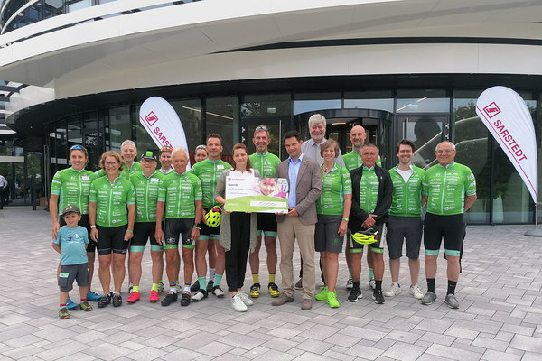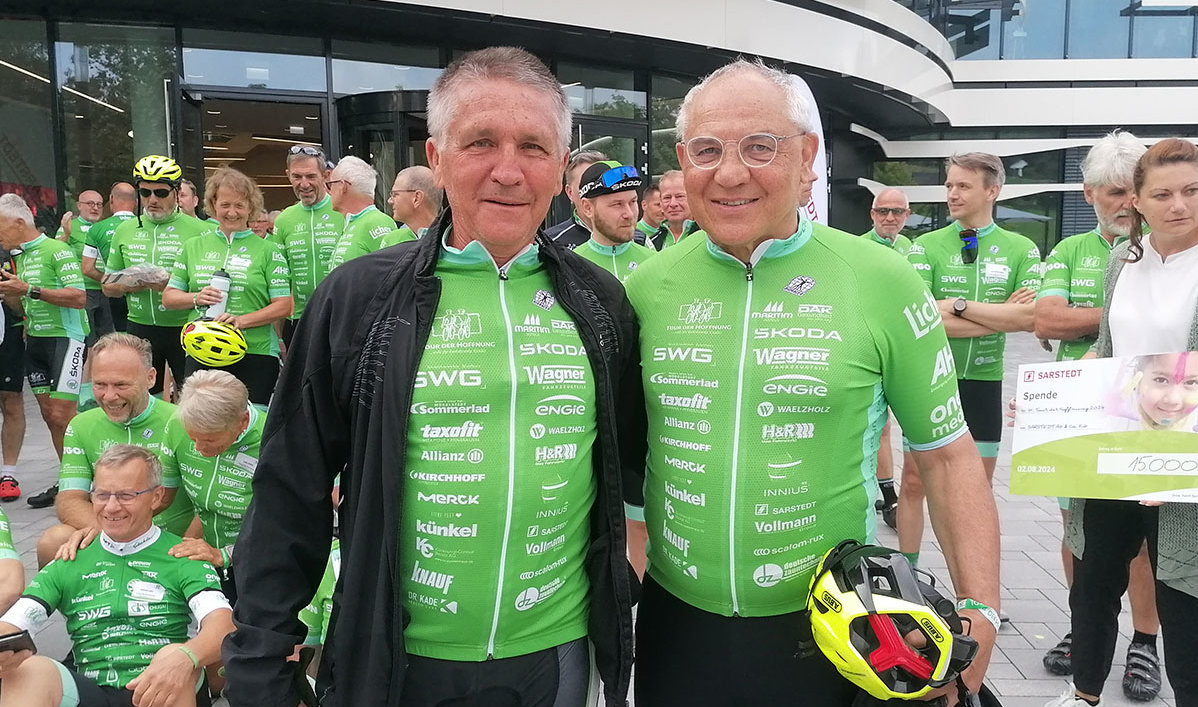 Insgesamt wird die Tour von mehr als 70 Partnern unterstützt. Zwei davon kommen aus dem Oberbergischen. Neben der Firma Sarstedt aus Nümbrecht engagiert sich auch Schwalbe (Ralf Bohle) aus Reichshof für die Tour. Seit 2001 ist Sarstedt als Tour-Sponsor mit dabei. „Wir haben bei unserem Sommerfest zum Spenden für die Tour aufgerufen. Es sind 15.000 Euro geworden“, freute sich Timo Schretzmair, Vorstand der Sarstedt. Auch Nümbrechts Bürgermeister Hilko Redenius war aufs Firmengelände gekommen. Er dankte allen Beteiligten für ihr Engagement zugunsten der Kinder und wünschte: „Kommen Sie heil ins Ziel!“
