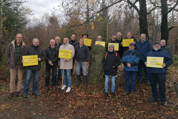 [Der „Dreiherrenstein am Hofe Kamp“, an dem sich die Landwirte der „Mittelgebirgsallianz“ mit den politischen Vertretern getroffen haben, gilt als Grenzpunkt zwischen den Landkreisen Oberberg, Olpe und Altenkirchen.]
