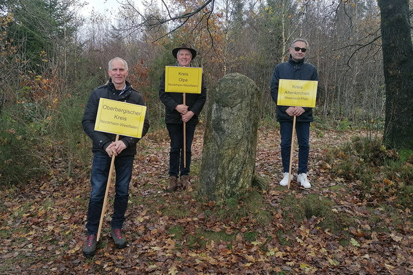 [Haben sich am „Dreiherrenstein am Hofe Kamp“ getroffen: (v.l.) Franz Bellinghausen, Vorsitzender der Kreisbauernschaft Oberberg, Michael Richard, Vorsitzender des Landwirtschaftlichen Kreisverbandes Olpe, und Josef Schwan, Vorsitzender des Kreisverbandes Altenkirchen.]