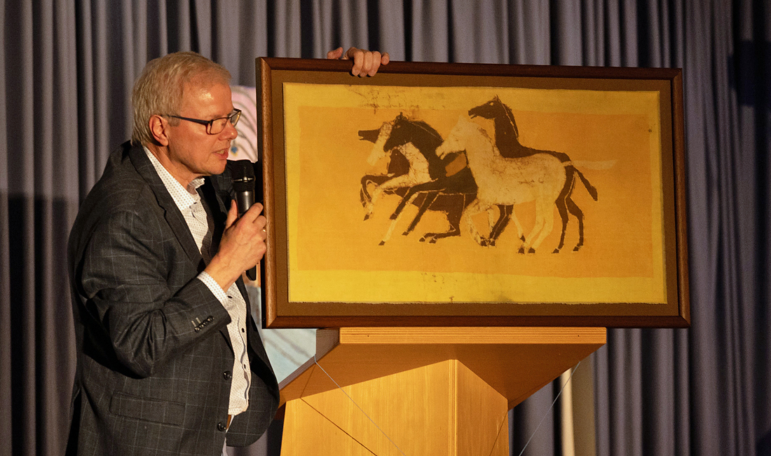 Natürlich hatte der scheidende Chef das letzte Wort. Aus einem Vergangenheits-Beutel zog er Erinnerungsstücke seiner Leitungsgeschichte, Symbole einer bewegten Lehrerlaufbahn, die ihn und die Gäste noch einmal emotional berührten: unter anderem einen Erinnerungsstein des ersten Abitur-Jahrgangs 1999, einen Handball, offensichtlichster Ausdruck der „Partnerschule des Leistungssports“, einen halb verzehrter Schokoladen-Nikolaus und mehr. Zum Schluss appellierte Krug bei der Präsentation des Bildes einer galoppierenden Pferdegruppe, das immer in seinem Büro hing, an Schüler, Eltern, Kollegium, Schulleitung und Schulträger, auch in Zukunft trotz individueller Gangarten zum Wohle der Schule immer gemeinsam in eine Richtung zu ziehen. Abschließend überreichte symbolisch seinen grünen Kugelschreiber an seinen designierten Nachfolger.