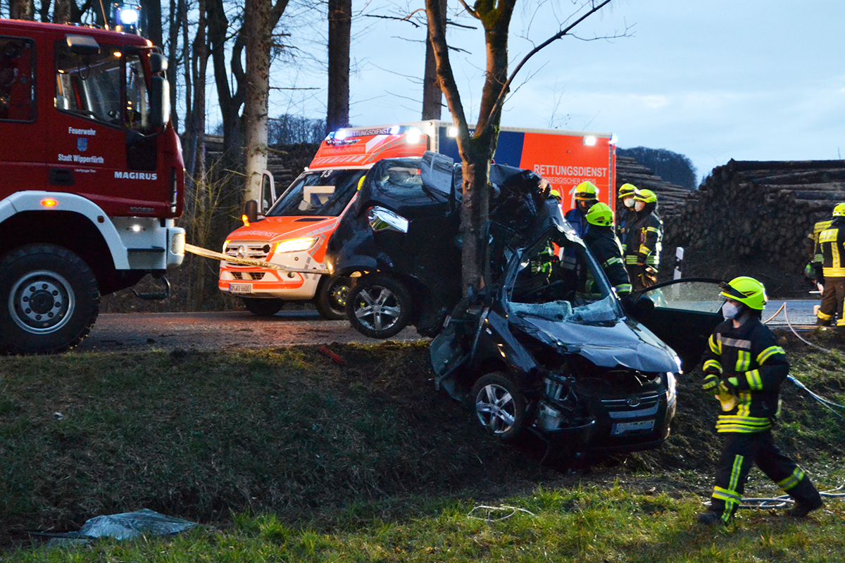 Lebensgefährliche Verletzungen zog sich am frühen Abend ein 20-jähriger Wipperfürther bei einem Verkehrsunfall auf der L 286 zu. Der Mann hatte gegen 17:50 Uhr auf dem geraden Teilstück zwischen den Ortschaften Erlen und Drecke laut Polizeiangaben vor Ort aus noch unbekannter Ursache die Kontrolle über seinen Wagen verloren und war nach links von der Fahrbahn abgekommen. Das Auto prallte bei dem Alleinunfall seitlich mit voller Wucht gegen einen Baum, der 20-Jährige wurde hierbei laut Thomas Lamsfuß, stellvertretender Leiter der Feuerwehr Wipperfürth, im Fußbereich eingeklemmt.